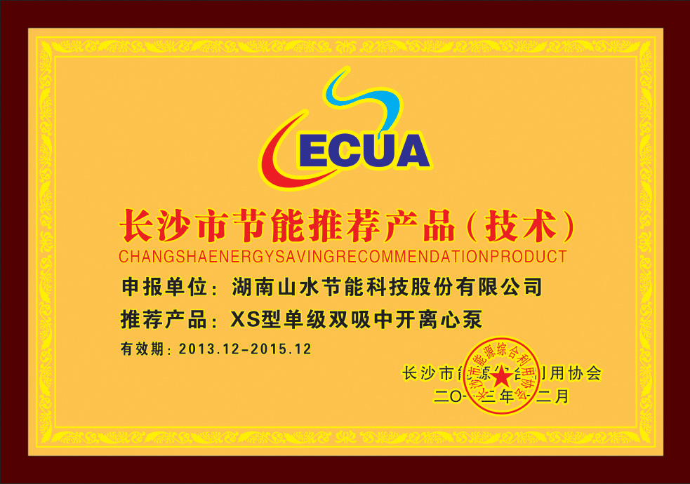 2013年11月底,由我公司提交的山水牌XS型單級雙吸中開離心泵,通過了長沙市能源局和長沙市能源綜合利用協(xié)會組織專家進(jìn)行的評審,獲選2013年度長沙市優(yōu)秀節(jié)能產(chǎn)品推薦品牌,為公司的品牌戰(zhàn)略的建設(shè)和為下一步擴(kuò)大公司品牌影響力打好了堅實基礎(chǔ)。