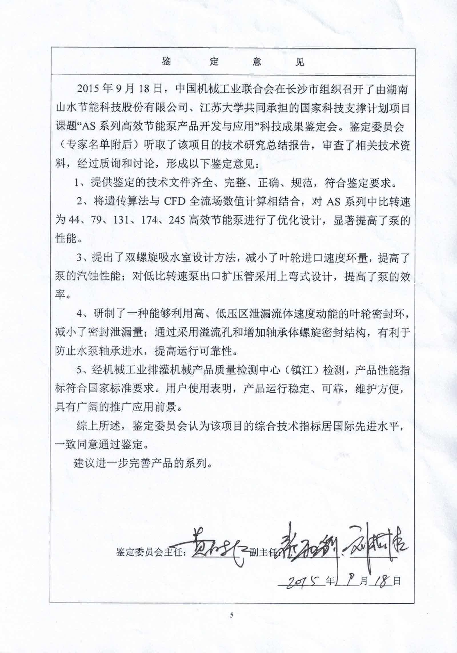 2015年9月18日,中國機(jī)械工業(yè)聯(lián)合會在長沙市組織召開了由湖南山水節(jié)能科技股份有限公司、江蘇大學(xué)共同承擔(dān)的國家科技支撐計劃項目課題“AS系列高效節(jié)能泵產(chǎn)品開發(fā)與應(yīng)用”科技成果鑒定會。鑒定會由中國機(jī)械工業(yè)聯(lián)合會馬敬坤處長主持,華中科技大學(xué)能源與動力工程學(xué)院院長黃樹紅教授擔(dān)任鑒定委員會主任,中國通用機(jī)械工業(yè)協(xié)會秘書長張雨豹高工、武漢大學(xué)劉梅清教授擔(dān)任副主任。委員包括中國通用機(jī)械工業(yè)協(xié)會泵業(yè)分會總工程師李樹斌教授級高工、長沙理工大學(xué)李志鵬教授、中南林業(yè)科技大學(xué)張奇志高工以及機(jī)械工業(yè)排灌機(jī)械產(chǎn)品質(zhì)量檢測中心(鎮(zhèn)江)李偉副研究員。
