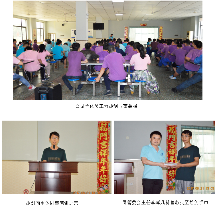 病魔無情,人間有情,為胡劍加油!山水家人們紛紛伸出援助之手,慷慨解囊、熱心救助。通過8月14日至8月16日三天的募捐活動(dòng),共募集員工個(gè)人捐款21108元,以及瞿總代表公司捐款21008元、管委會(huì)捐款10504元,合計(jì)52620元,用于對(duì)胡劍家人的救助,山水這個(gè)大家庭大事有人管、小事有人做、難事有人幫、急事有支撐。