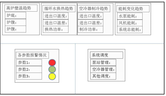 對與系統(tǒng)節(jié)能密切相關(guān)的參數(shù),顯示其歷史變化趨勢,這些參數(shù)應(yīng)當(dāng)包括但不限于循環(huán)水流量、高爐循環(huán)水進(jìn)口溫度、高爐循環(huán)水出口溫度、高爐循環(huán)水溫差、高爐循環(huán)水換熱量、空冷器循環(huán)水進(jìn)出口溫度及溫差、爐壁溫度值(最大值、最小值和平均值)、風(fēng)機(jī)功率、水泵功率和系統(tǒng)功率等。