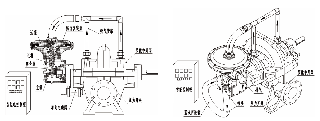 目前,國內(nèi)外使用的中開式雙吸離心泵,工作時(shí)需另設(shè)真空泵,將泵內(nèi)空氣排盡,或?qū)⒈冒惭b在液面以下,靠水倒灌才能啟泵工作。設(shè)置真空泵裝置占用泵房面積,且抽真空會(huì)有介質(zhì)積留,特別是泵送有毒有污染不潔凈介質(zhì)時(shí),真空泵裝置就不能使用;而水倒灌啟動(dòng)需要增加大量土建,兩種形式造價(jià)都較高。我公司拳頭產(chǎn)品ZXS強(qiáng)自吸高效節(jié)能中開泵完美的解決了以上問題。