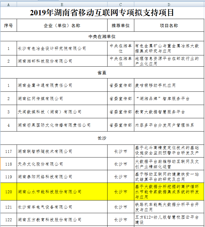 7月30日,根據(jù)《湖南省移動(dòng)互聯(lián)網(wǎng)產(chǎn)業(yè)發(fā)展專項(xiàng)資金管理暫行辦法》和省工信廳、省財(cái)政廳《關(guān)于做好2019年湖南省移動(dòng)互聯(lián)網(wǎng)產(chǎn)業(yè)發(fā)展專項(xiàng)資金項(xiàng)目申報(bào)工作的通知》,經(jīng)項(xiàng)目單位申請(qǐng),市州和財(cái)政省直管縣市工信部門、財(cái)政部門聯(lián)合審查推薦,項(xiàng)目資料初審及專家評(píng)審等程序,省工信廳會(huì)同省財(cái)政廳研究提出建議方案并報(bào)省人民政府審定,2019年湖南省移動(dòng)互聯(lián)網(wǎng)產(chǎn)業(yè)發(fā)展專項(xiàng)資金擬支持項(xiàng)目公示中湖南山水節(jié)能科技股份有限公司獲“基于大數(shù)據(jù)分析挖掘的高爐循環(huán)水節(jié)能專家數(shù)據(jù)集成系統(tǒng)的研發(fā)與應(yīng)用”專項(xiàng)資金的支持。