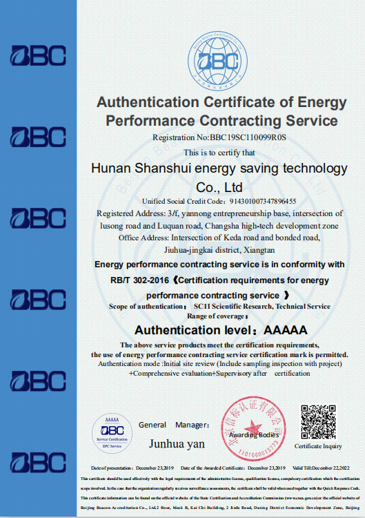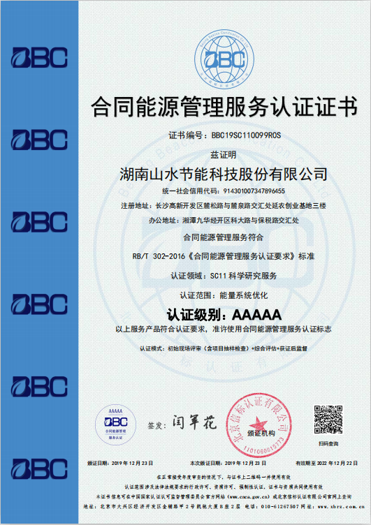 依據(jù)(RB/T 302-2016)《合同能源管理服務認證要求》,并通過專業(yè)認證機構(認證標準編制單位)資質審查、工廠及項目現(xiàn)場核查,綜合評定后,于2019年12月,湖南山水節(jié)能科技股份有限公司在“能量系統(tǒng)優(yōu)化”服務專業(yè)類別榮獲“合同能源管理服務最高等級認證(AAAAA)”。