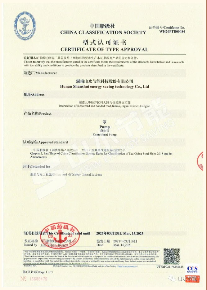 近日,湖南山水節(jié)能科技股份有限公司生產(chǎn)的離心泵系列船用泵獲得中國(guó)船級(jí)社頒發(fā)的型式認(rèn)可證書(shū),標(biāo)志著我司生產(chǎn)的船用離心泵在生產(chǎn)設(shè)計(jì)、工藝流程、產(chǎn)品質(zhì)量等方面均達(dá)到了國(guó)家船舶及海上設(shè)施標(biāo)準(zhǔn)要求。型式認(rèn)可證書(shū)的獲得為我司拓展船舶行業(yè)領(lǐng)域打下堅(jiān)實(shí)的基礎(chǔ),進(jìn)一步提高企業(yè)知名度,提升市場(chǎng)競(jìng)爭(zhēng)力。