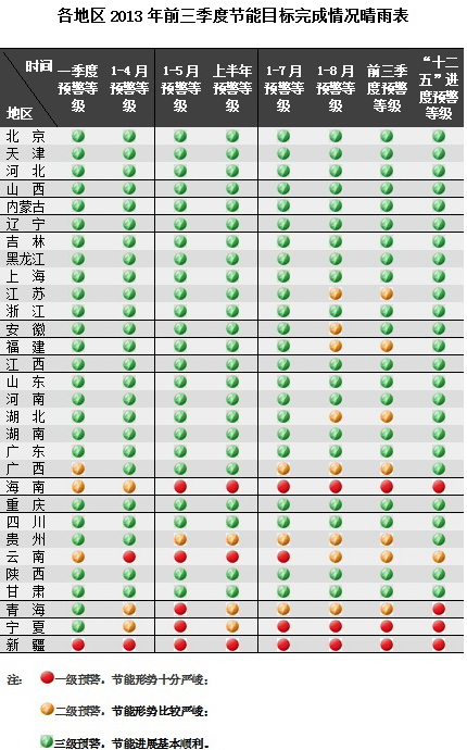 國家發(fā)改委日前公布《各地區(qū)2013年前三季度節(jié)能目標完成情況晴雨表》(以下簡稱《晴雨表》),對各省份前三季度的節(jié)能減排形勢進行預警。