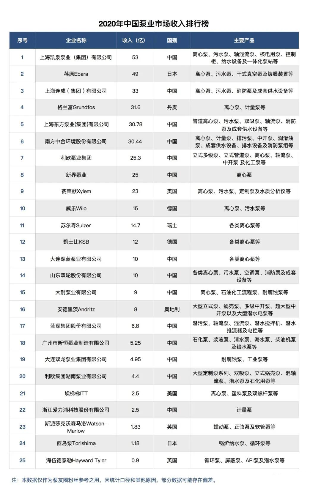 2020年中國泵業(yè)市場(chǎng)收入排行榜